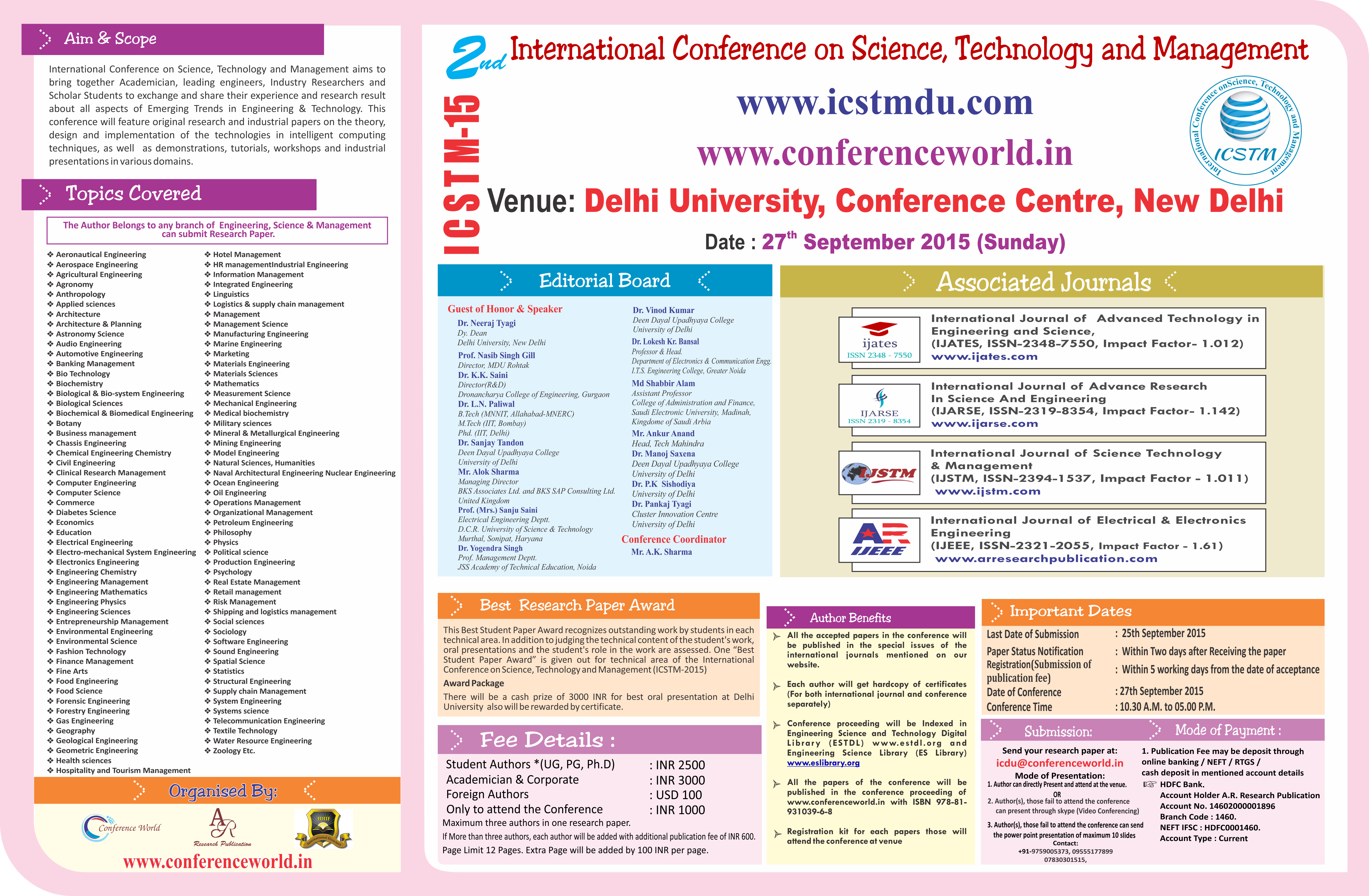 This Best Paper Award recognizes outstanding work by students in each technical area. In addition to judging the technical content of the student’s work, oral presentations and the student’s role in the work are assessed. One “Best Paper Award” is given out from technical area of the 2nd International Conference on Science, Technology and Management (ICSTM-2015)