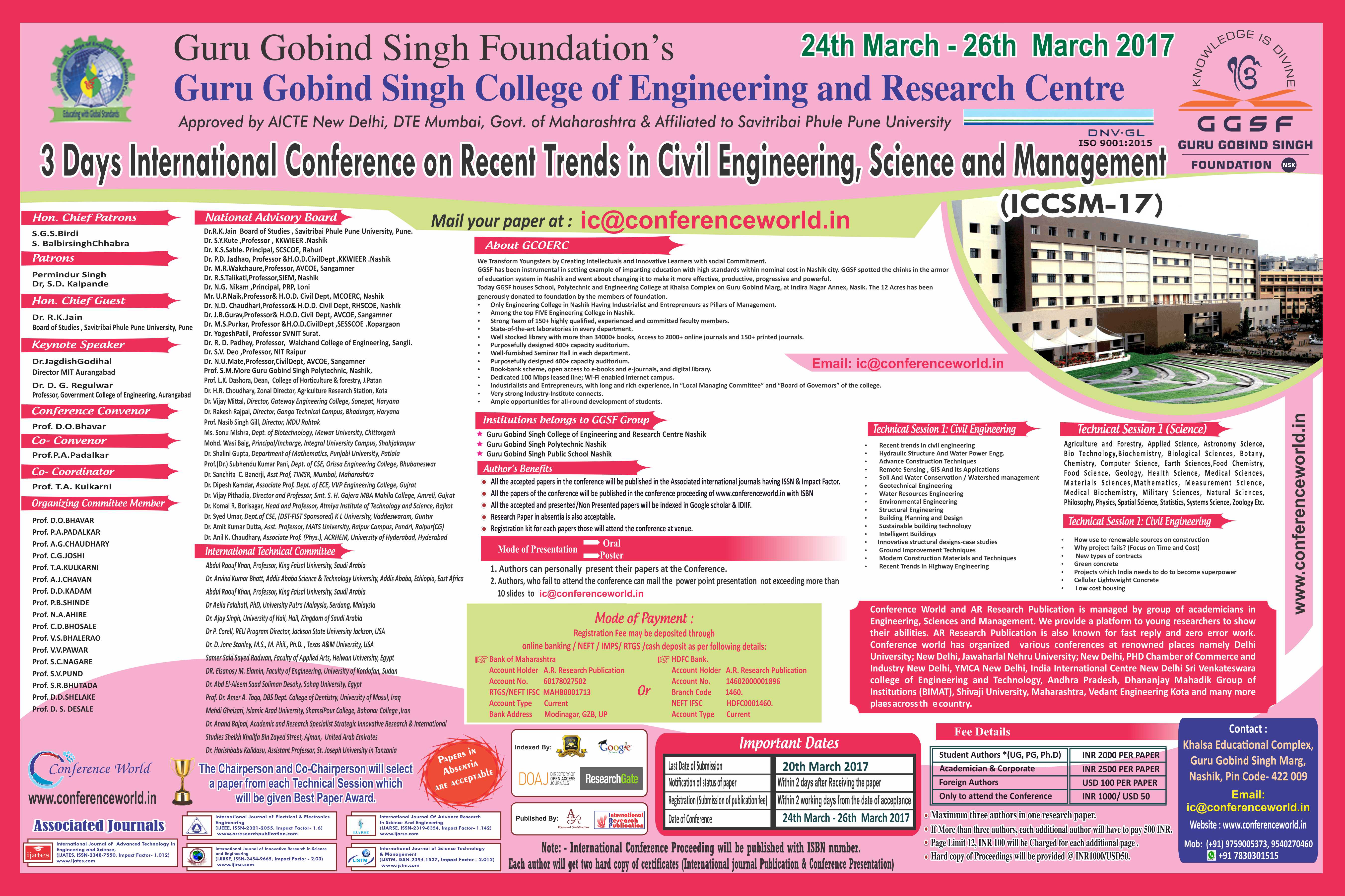 It gives us immense pleasure to inform you Guru Gobind Singh College of Engineering and Research Center, Nashik is hosting 3 Days International Conference on Recent Trends in Civil Engineering, Science and Management [ICCSM-17] on 24th March – 26th March 2017 with the collaboration of AR Research Publication and Conference World Team, to contribute original research papers.
