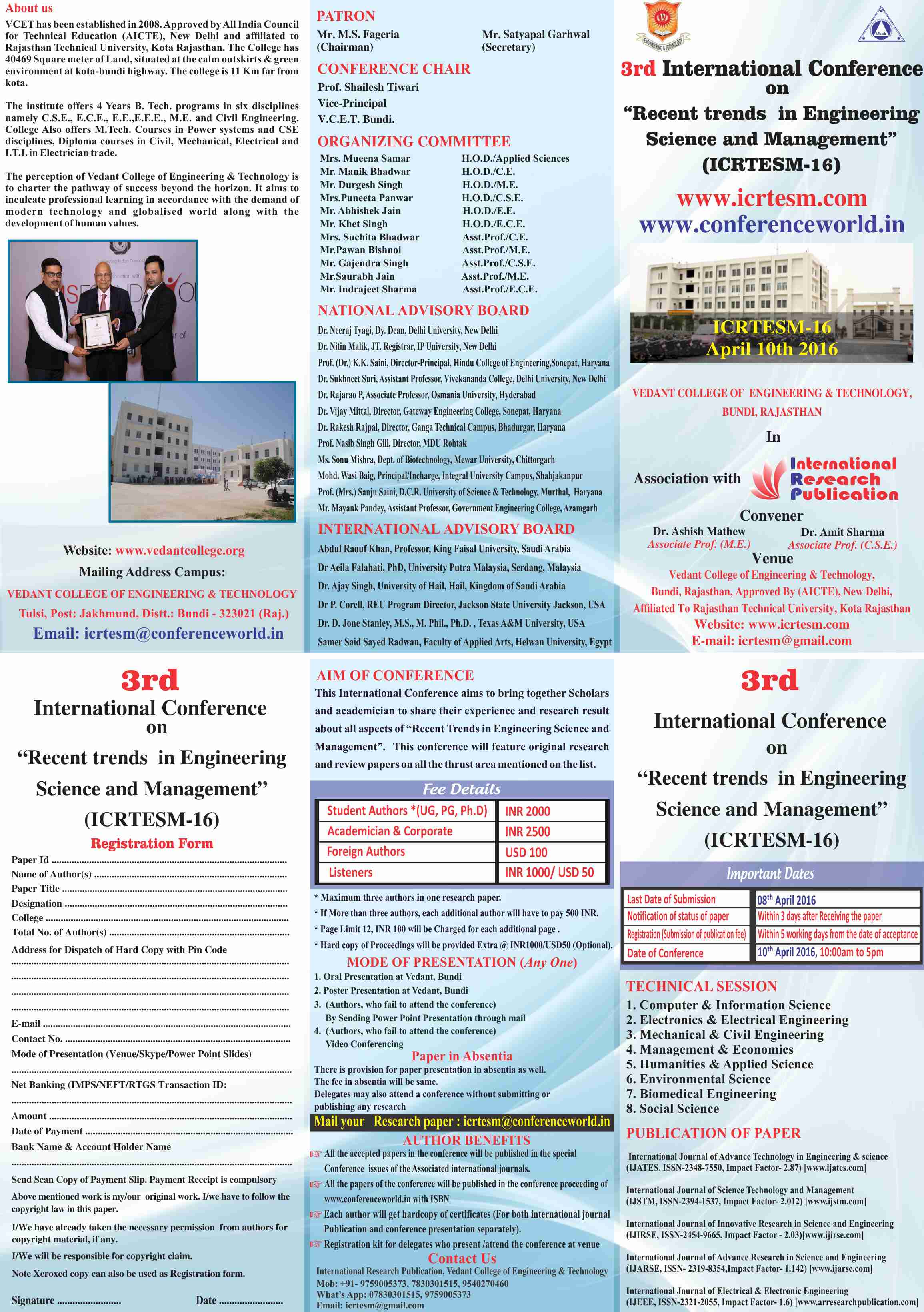 It gives us immense pleasure to inform you that Vedant College of Engineering and Technology, Bundi, Rajasthan is hosting an International Conference on Recent Trends in Engineering, Science and Management on 10 April, 2016 in association with International Research Publication team, to contribute original research papers.